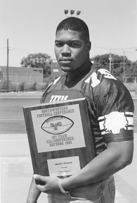 Michael Strahan TSUStrahan joue une année au lycée de Westbury High School, et il montre rapidement des grandes qualités pour le poste de Defensive End. Il reçoit une offre de Texas Southern University, la même fac que celle dans laquelle est allé son oncle. Mais il a le mal du pays, et lorsqu’il revient en Allemagne pour terminer sa scolarité lycéenne, il ne veut pas vraiment retourner aux USA. Son père finit par le convaincre, et le jeune homme s’installe sur le campus de TSU. Il progresse d’année en année, devenant quasiment impossible à arrêter pour un Linemen seul ; néanmoins, malgré les double team, il enregistre 41.5 sacks sur quatre années, avec notamment une campagne senior où il en accumule 19. Il fait également du dégât contre la course avec beaucoup de plaquages à perte, et sa domination lui permet d’être nommé All-American. Si Michael ne visait pas forcément la NFL au début de sa carrière à TSU, maintenant c’est un passage obligé.