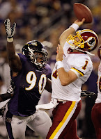 Baltimore s’est rassuré. Enfin, Joe Flacco s’est rassuré. Avec un début de match catastrophique qui se conclut par une interception de DeAngelo Hall, qui en profite pour inscrire un TD. Ensuite ça va mieux, Flacco enchaîne de bons drives, de bonnes passes dans les mains de ses WRs et deux TDs, un de 35 yards pour Lee Evans et un deuxième de 12 yards pour Anquan Boldin. Mais le QB n’aurait pas pû faire un tel match sans sa ligne, car, ce fût flagrant pendant ce match, quand la ligne offensive tient, Joe Flacco explose. Tyrod Taylor, le rookie Qb, a encore une fois montré qu’il était un bon back-up avec un TD pour Brandon Jones et un bon coureur avec deux courses (de 15 et 16 yards). Pour les RBs, on ne s’inquiète plus pour Ray Rice avec une course 22 yards où il détruit des défenseurs adverses. Ricky Williams n’a pas brillé mais n’a pas déçu, ses performances restent mystérieuses. Dans le corps de WRs, Torrey Smith ne concrétise toujours pas avec ses 2 balles droppées, tandis que le rookie Tandon Doss confirme ses bonnes performances précédentes.Le WR en provenance de Buffalo, Lee Evans a bien démontré qu’il était le WR de deep qu’il fallait à Baltimore avec un TD de 35 yards catché sur la ligne de fond de la end-zone. Enfin, il faut tout de même noter que la connexion Joe Flacco – Anquan Boldin fonctionne toujours bien.