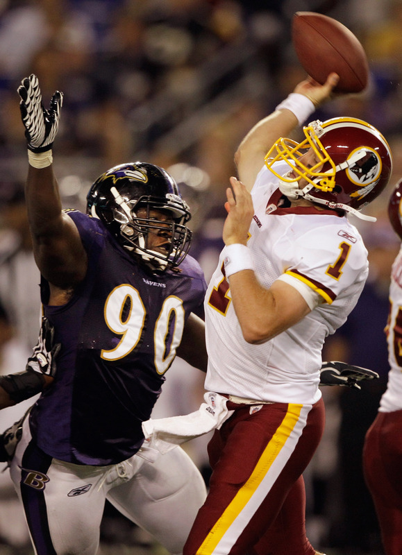 Baltimore s’est rassuré. Enfin, Joe Flacco s’est rassuré. Avec un début de match catastrophique qui se conclut par une interception de DeAngelo Hall, qui en profite pour inscrire un TD. Ensuite ça va mieux, Flacco enchaîne de bons drives, de bonnes passes dans les mains de ses WRs et deux TDs, un de 35 yards pour Lee Evans et un deuxième de 12 yards pour Anquan Boldin. Mais le QB n’aurait pas pû faire un tel match sans sa ligne, car, ce fût flagrant pendant ce match, quand la ligne offensive tient, Joe Flacco explose. Tyrod Taylor, le rookie Qb, a encore une fois montré qu’il était un bon back-up avec un TD pour Brandon Jones et un bon coureur avec deux courses (de 15 et 16 yards). Pour les RBs, on ne s’inquiète plus pour Ray Rice avec une course 22 yards où il détruit des défenseurs adverses. Ricky Williams n’a pas brillé mais n’a pas déçu, ses performances restent mystérieuses. Dans le corps de WRs, Torrey Smith ne concrétise toujours pas avec ses 2 balles droppées, tandis que le rookie Tandon Doss confirme ses bonnes performances précédentes.Le WR en provenance de Buffalo, Lee Evans a bien démontré qu’il était le WR de deep qu’il fallait à Baltimore avec un TD de 35 yards catché sur la ligne de fond de la end-zone. Enfin, il faut tout de même noter que la connexion Joe Flacco – Anquan Boldin fonctionne toujours bien.