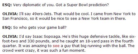 L’occasion de passer aux choses sérieuses, la cheerleader de la semaine chez Esquire est Olivia des Niners. Avec ses meilleures réponses, bien entendu (Olivia, si tu veux voir quelqu’un qui a le physique de Sopoaga, appelle le 06.75…. Oh, Forget it)