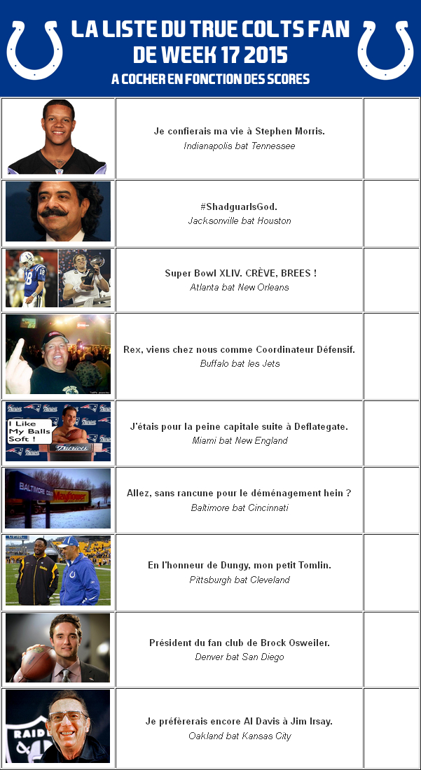 LatestHuddle se plie en quatre et vous offre, à vous Colts Fans, votre liste personnelle des 9 matchs qui vont vous intéresser. Vous pouvez l’imprimer et faire des petites croix, des poinçons, dessiner des têtes de mort, utiliser comme cible de fléchettes ou comme défouloir/litière pour votre animal de compagnie, au choix (mais svp mettez ça dans la poubelle quand vous aurez fini, sauvons-la-planète-COP21).